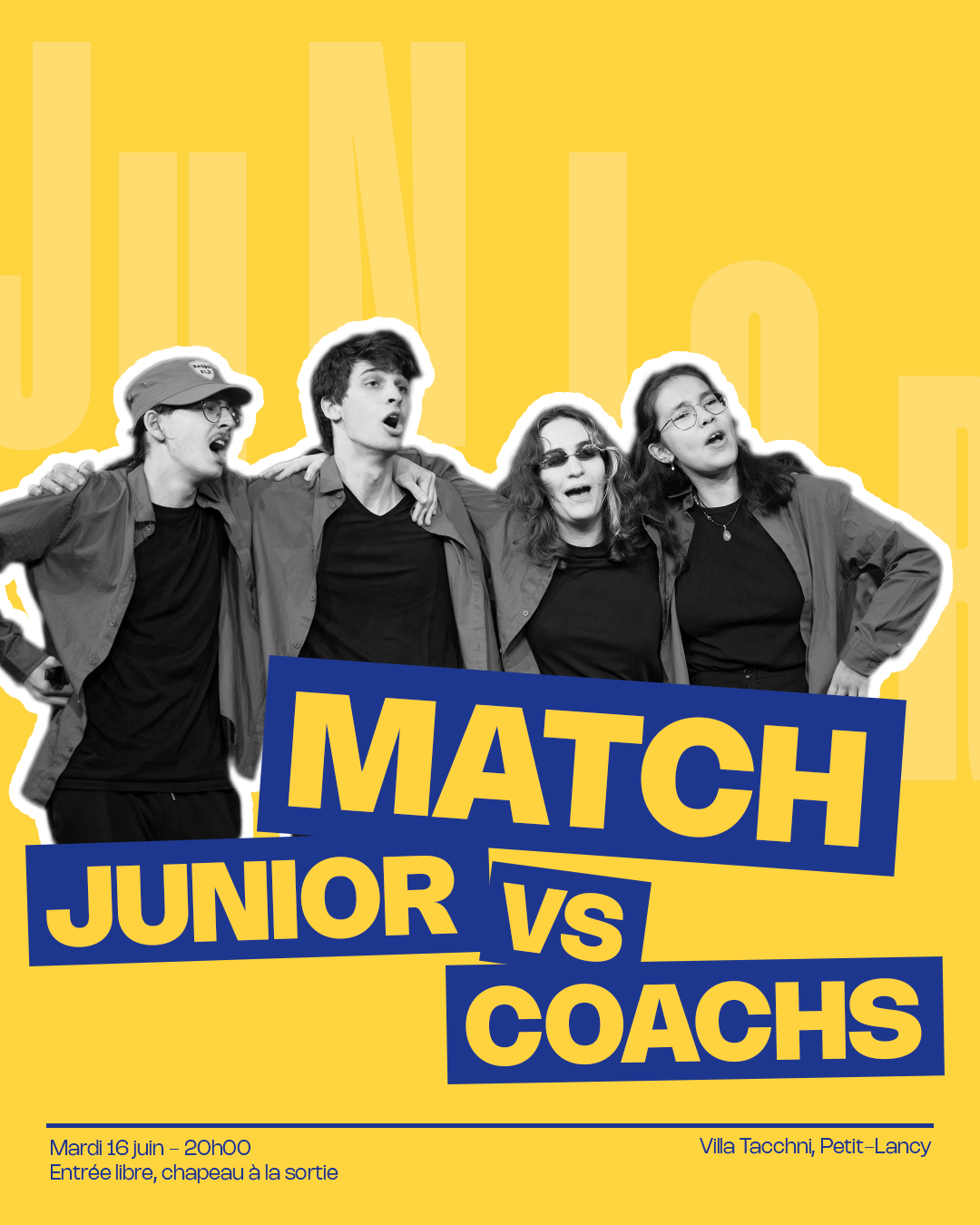 Match Juniors VS Majeurs à la Villa Tacchini, Petit-Lancy Entrée libre, chapeau à la sortie Match Juniors VS Majeurs Les improvisateurs·ices de la ligue Junior affrontent la ligue Majeur lors […]